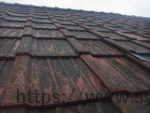 屋根はセメント瓦、劣化がひどく塗装が剥げて苔が生えています。